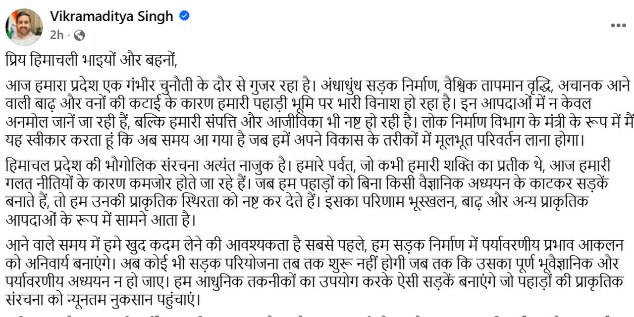 Vikramaditya Singh vows no new road projects without scientific studies, announces afforestation and water conservation plans