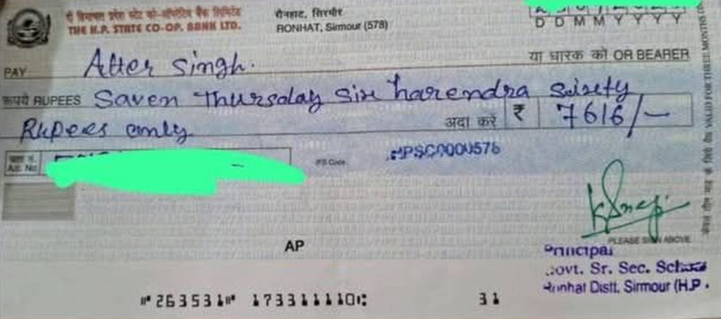 The cheque, dated September 25 and issued for ₹7,616 in the name of a mid-day meal worker, Atter Singh, was rejected by the bank after the issuer repeatedly fumbled with even basic English words. Instead of writing “seven,” the cheque carried “saven.” For “thousand,” the writer astonishingly used “Thursday.” While “six” appeared correctly, “hundred” was transformed into “harendra,” and “sixteen” was written as “sixty.”