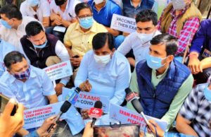 Shimla: State-wide protest of the Himachal Youth Congress and NSUI brigade, against holding offline exams of final year Under Graduate (UG) students in Covid...
